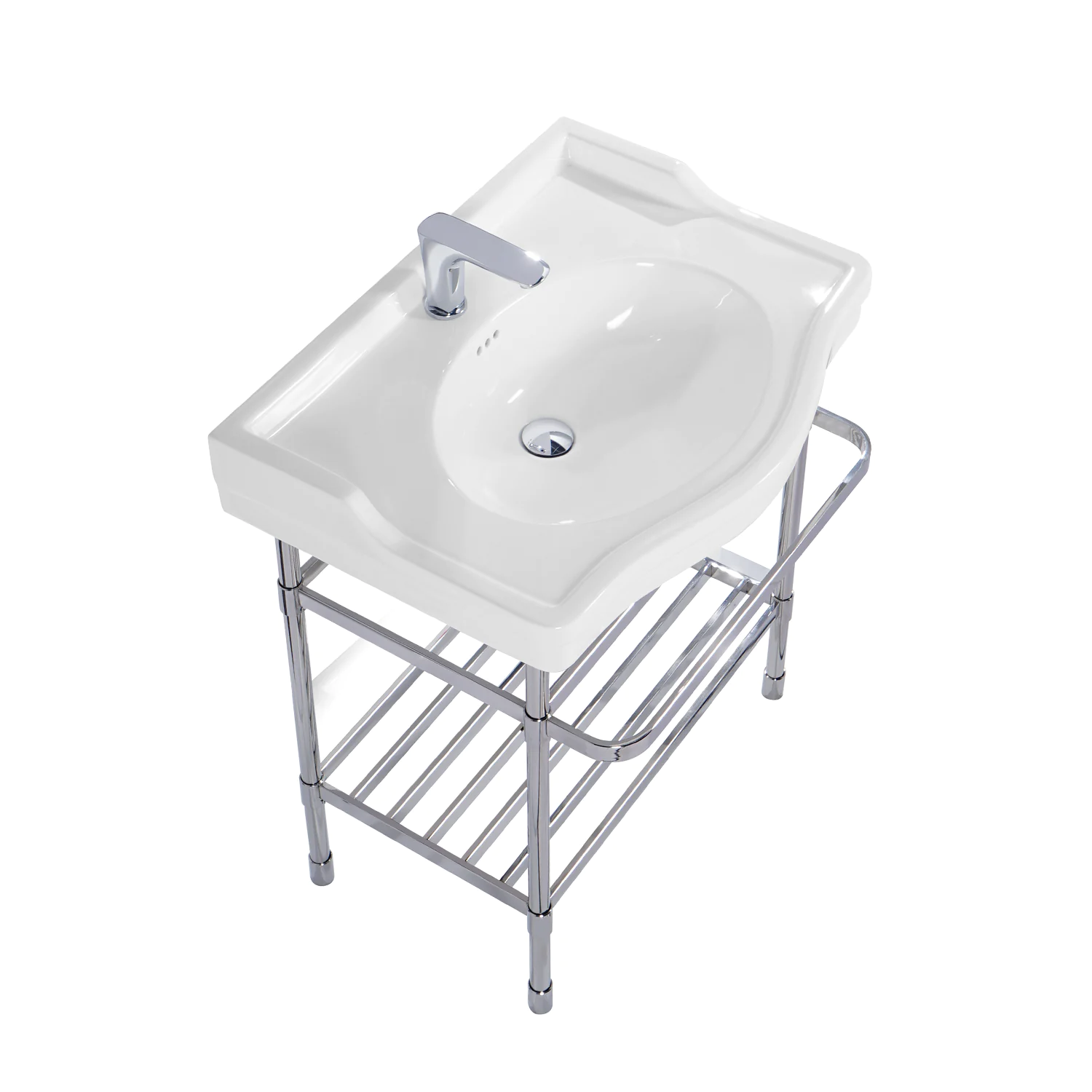 Bathroom high-quality glassy white vitreous china porcelain 77cm / 30-inch basin with 304 stainless steel chrome console legs, freestanding bathroom metal console sink